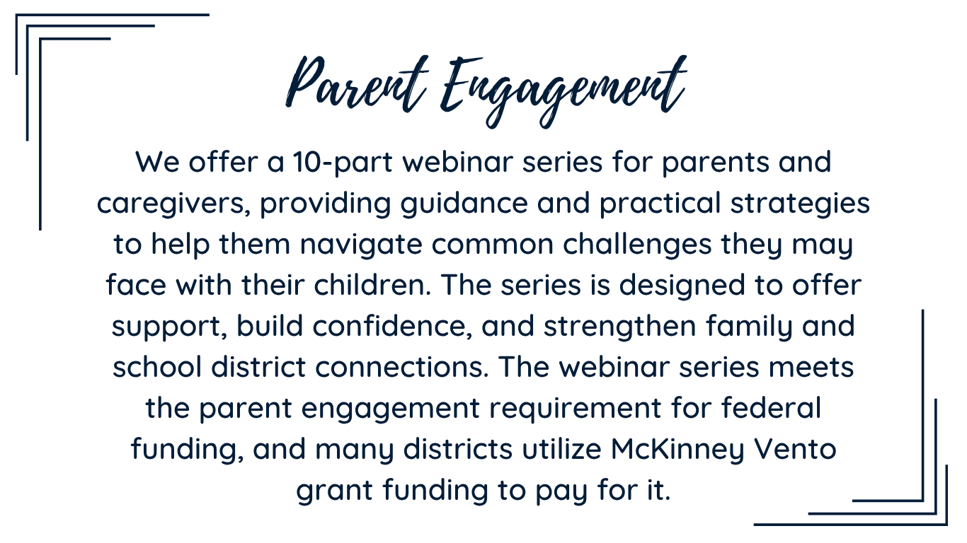 We know that partnerships with parents and caregivers are a critical part of student achievement. Therefore, we created a webinar series that provides practical, research-based strategies and support for families as they face the many challenges of raising a child. Take a look at a sample of our webinars and join us on our journey toward building educational excellence in school districts.